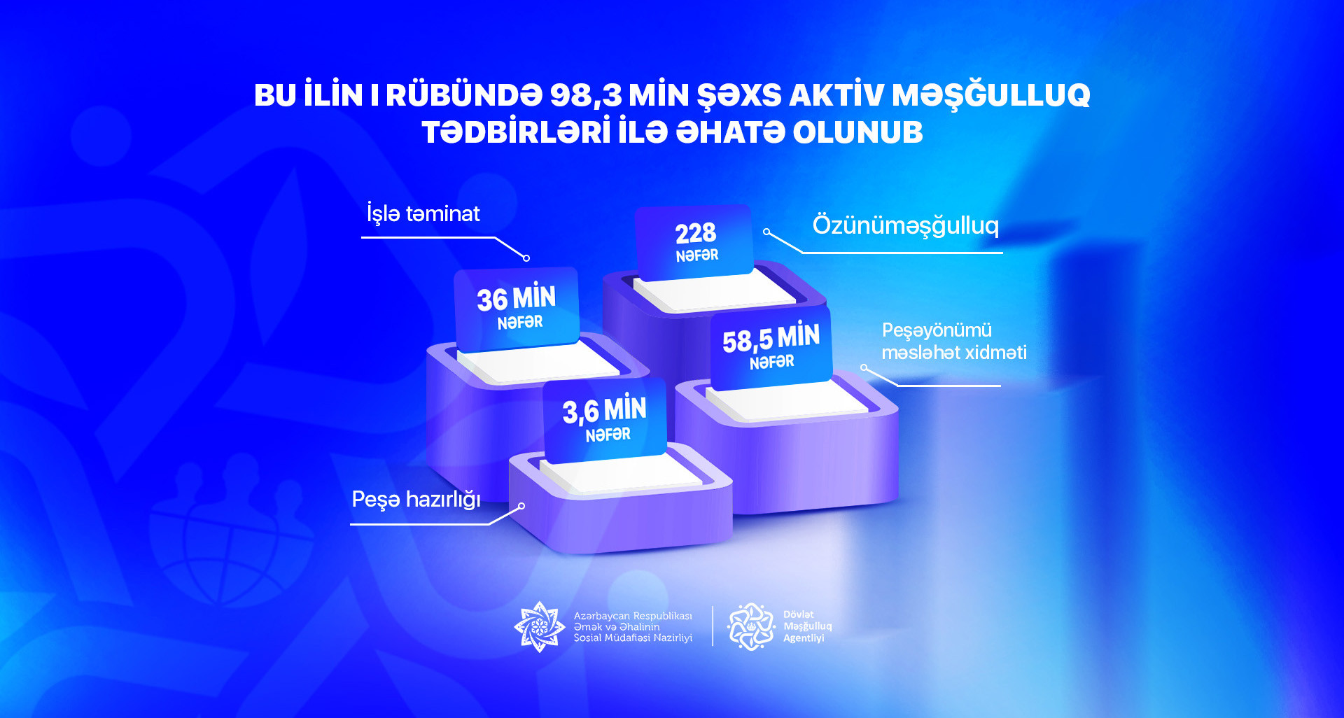 3,6 min işsiz şəxs üçün isə peşə hazırlığı kursları təşkil olunub, 58,5 min şəxsə peşəyönümü xidmətlər göstərilib.